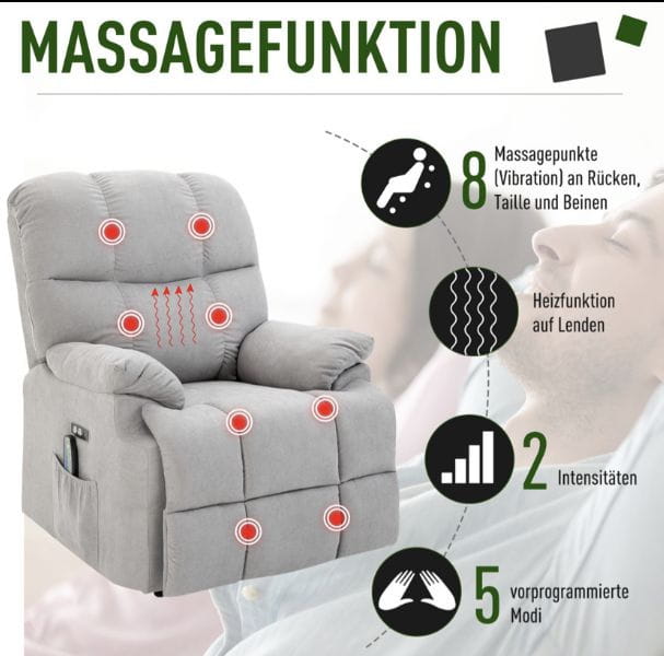 Fotel do masażu firmy HOMCOM nie tylko dobrze wygląda, ale jest również praktyczny. Zintegrowana pomoc do wstawania pomaga przejść z pozycji siedzącej do pozycji stojącej. 8 głowic masujących oraz funkcja grzania zapewniają dużo relaksu. Wszystkie tryby i ustawienia można wygodnie wprowadzać za pomocą pilota. Wbudowana funkcja rozkładania zapewnia dodatkowy komfort. Ciesz się prawdziwymi chwilami dobrego samopoczucia dzięki temu fotelowi do masażu firmy HOMCOM.