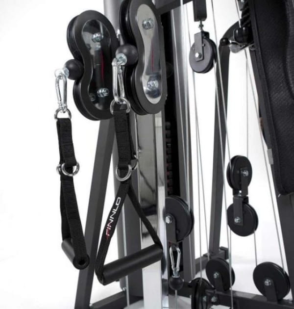 Z boku FINNLO Autark 2200 znajduje się pionowo regulowana podwójna wieża linowa. Można ją również wykorzystać do wykonywania dowolnych ćwiczeń. Górny, środkowy i dolny wyciąg pozwalają na przykład na trening nóg, bicepsa, tricepsa, brzuszki, trening rotatora, wyciąg LAT, ćwiczenia wiosłowe i wiele innych ćwiczeń. Dowolny trening gwarantuje dodatkowe bodźce, które z pewnością przyczynią się do ogromnego wzrostu mięśni.