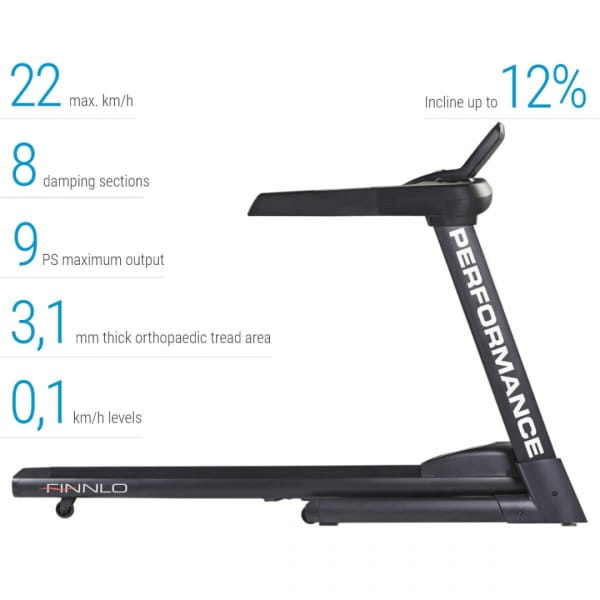 Dzięki wydajnemu, cichemu i doskonale dostosowanemu silnikowi o mocy ciągłej 3,5 KM, który osiąga maksymalną moc 9 KM, FINNLO Performance oferuje szeroki zakres prędkości od 0,8 km/h do 22 km/h. Dzięki temu bieżnia FINNLO Performance nadaje się zarówno do rehabilitacji, jak i do uprawiania sportów na najwyższym poziomie, a także zapewnia zorientowany na zdrowie trening biegowy z regulacją tempa biegu z dokładnością do 0,1 km/h.