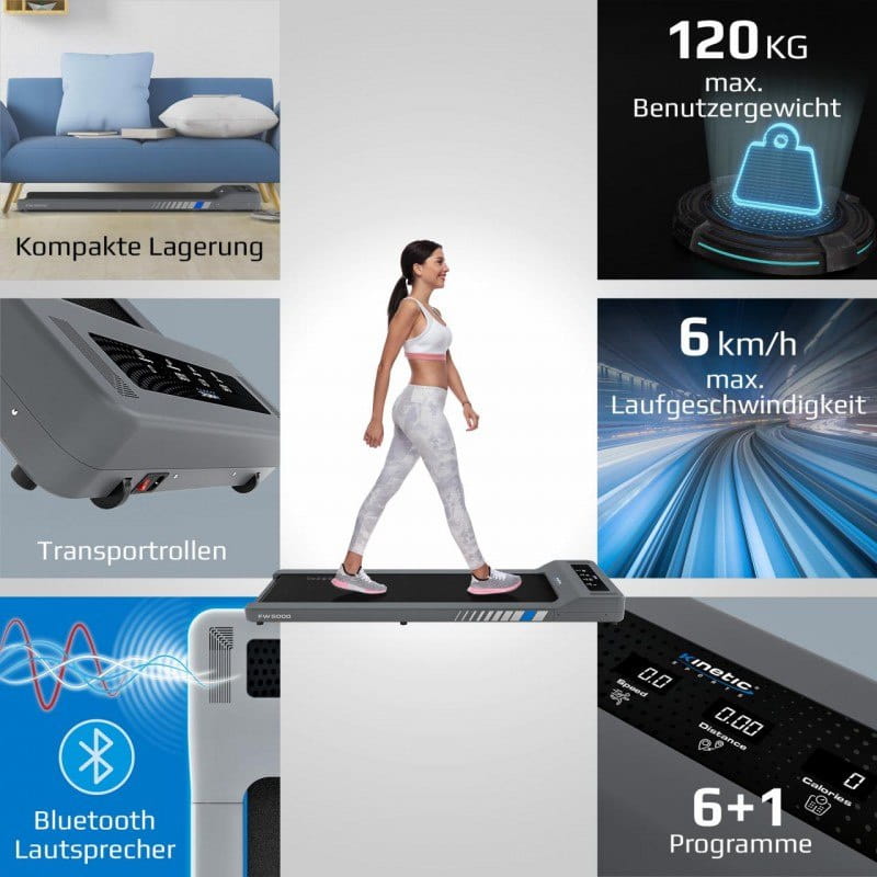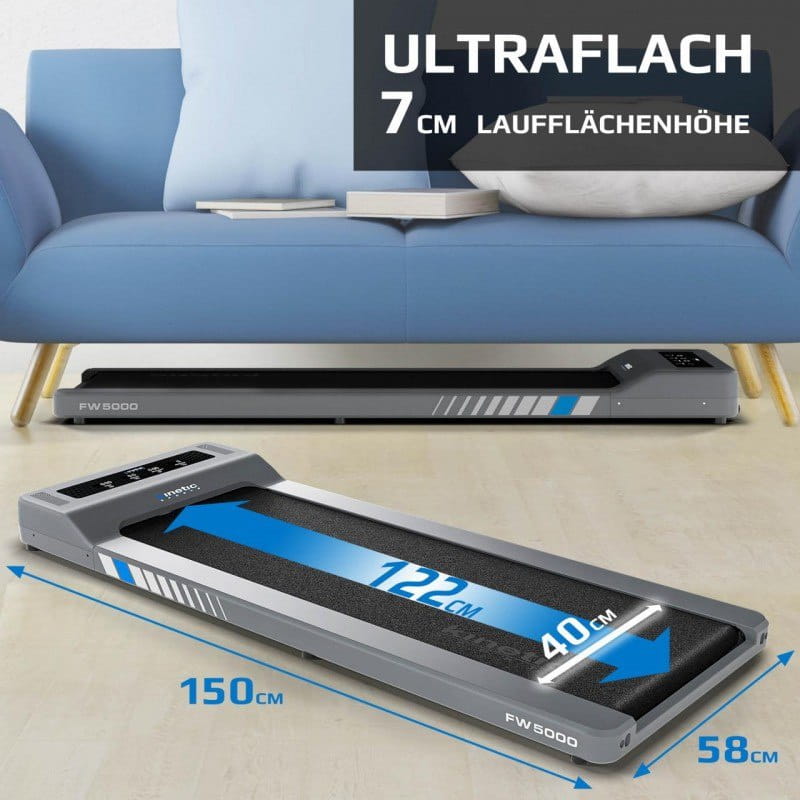 Bieżnia FlatWalk została specjalnie zaprojektowana do ergonomicznego i przyjaznego dla zdrowia treningu, szczególnie do poruszania się w miejscu pracy. Ale bieżnię można również szybko ustawić i używać w domu. Dzięki płaskiej konstrukcji bieżnię można łatwo rozłożyć i schować po przejściu. Cichy, ale mocny silnik elektryczny o mocy 750 W umożliwia rozpędzanie się do 6 km / h, a duża powierzchnia spacerowa zapewnia komfort podczas chodzenia. Komputer treningowy zapewnia skuteczną kontrolę wydajności i można nim sterować za pomocą pilota na nadgarstku.