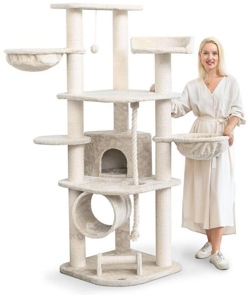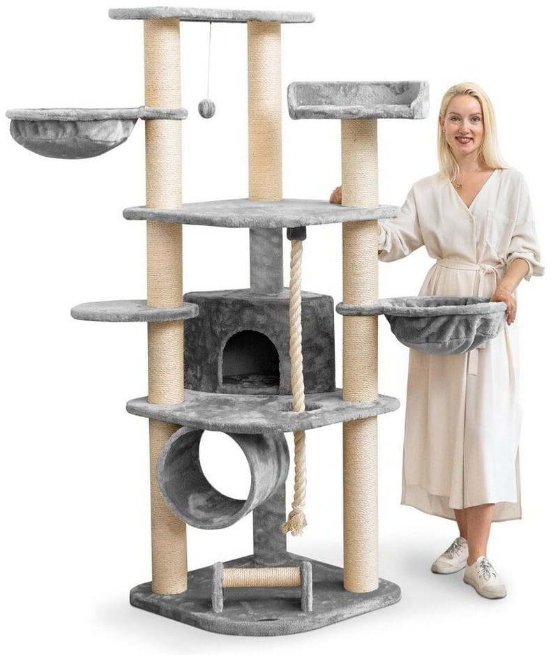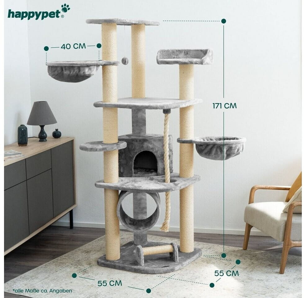 Duży drapak Happypet CAT028 oferuje Twojemu kotu mnóstwo okazji do zabawy. Drapak jest szczególnie stabilny i niezawodny dzięki konstrukcji na trzech kolumnach i bardzo mocnej podstawie o grubości 2 cm. Duże platformy łączące bagażnik i solidne wnęki do opalania (obciążenie do 15 kg) zapewniają dodatkowe bezpieczeństwo. Jest też dużo miejsca na cichsze i przytulne chwile. Jaskinie i puszyste platformy widokowe zachęcają do drzemki lub ukrycia się.