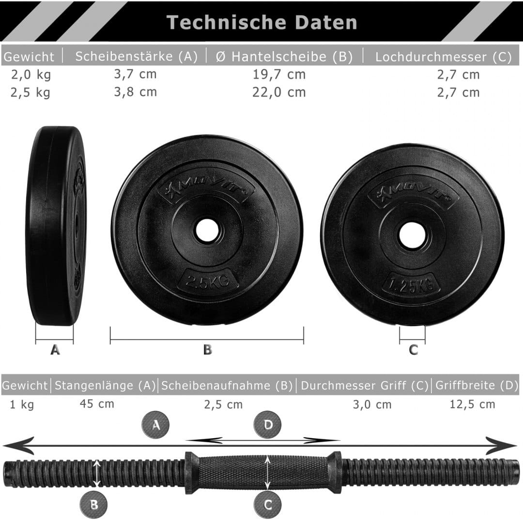Zestaw hantli MOVIT „BASIC” 2 szt. 30 kg SKŁADA SIĘ Z: 2 obciążniki 15 kg, które są podzielone w następujący sposób: 8 krążków 2,5 kg, 4 krążków 1,25 kg, 4 krążków 0,75 kg, 2 szt. Sztanga, 4 x zamki gwiazdowe