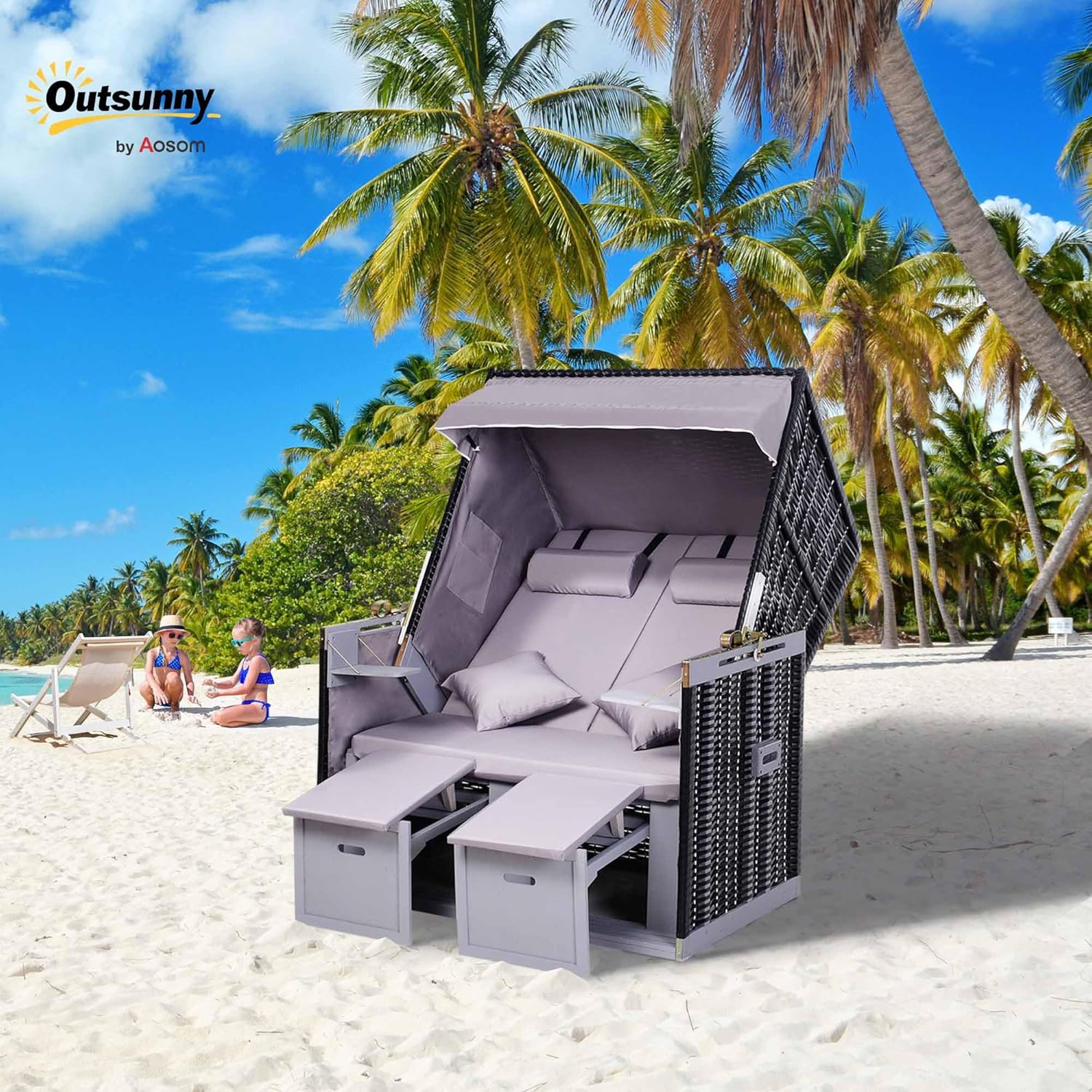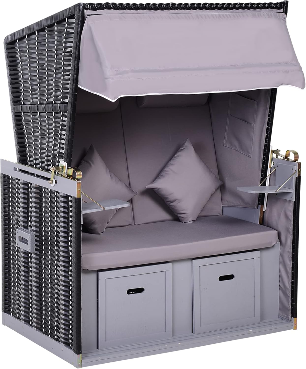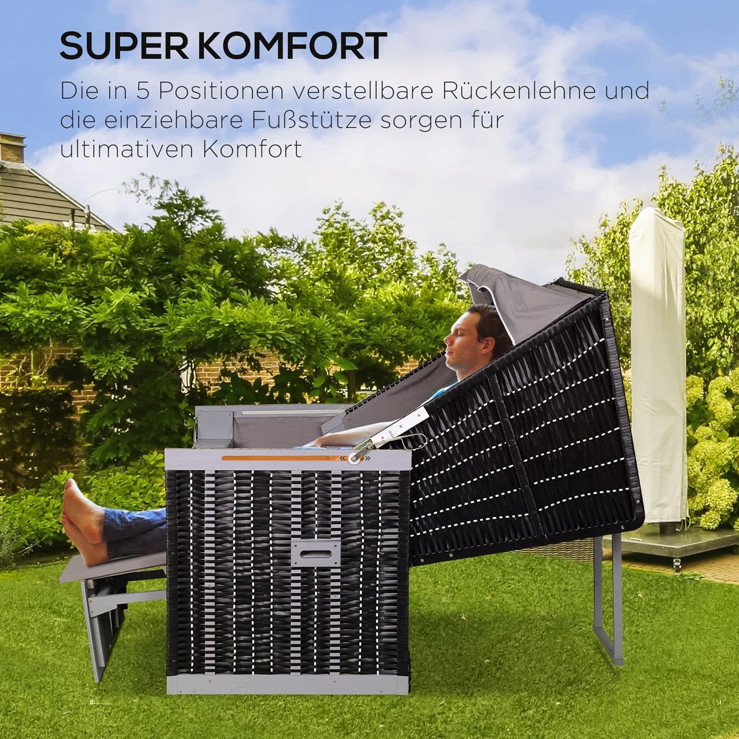 Elegancki i jednocześnie przytulny: Kosz plażowy firmy Outsunny dla dwóch osób przyciąga wzrok. Dobrze sprawdza się zarówno na tarasie, jak i w ogrodzie i oferuje wszystko, co znasz z koszy plażowych na urlopie: dwa praktyczne składane stoły, wysuwane podnóżki, dach przeciwsłoneczny do podniesienia i wielostopniowo regulowane oparcie. Dzięki temu w łatwy sposób uzyskasz w domu prawdziwe uczucie na plaży i urlopie.