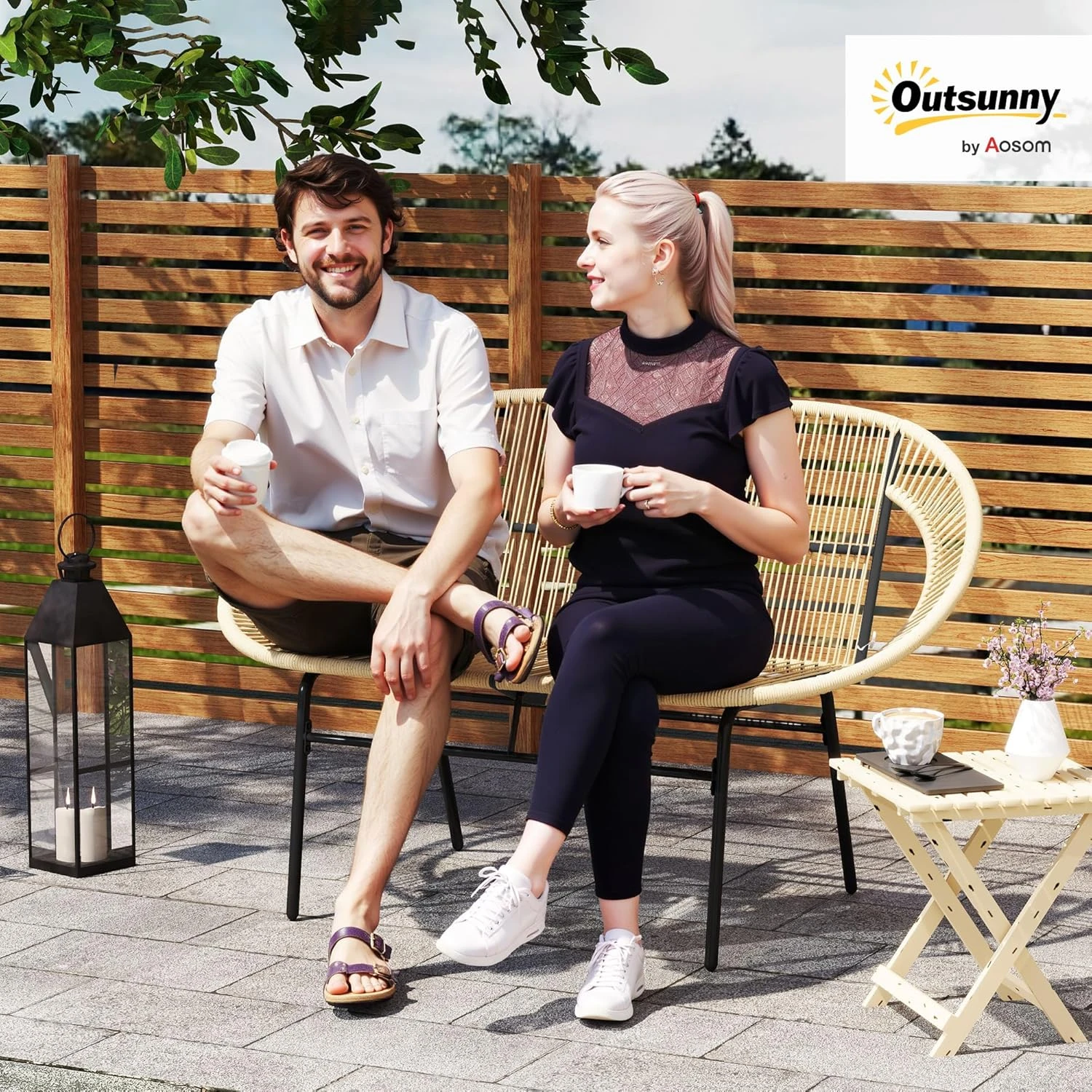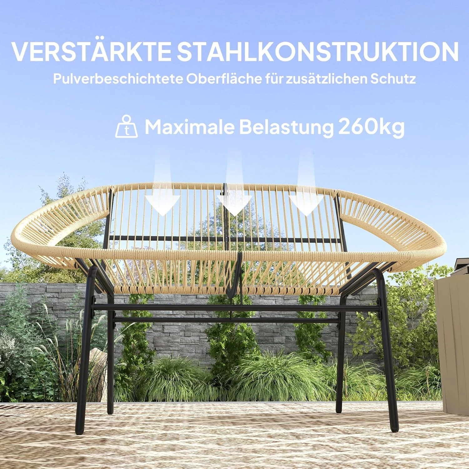 - Wygodne siedzenie: zaprojektowane dla dwóch osób, to przestronne krzesło ogrodowe zapewnia wystarczająco dużo miejsca, aby się zrelaksować i odprężyć. Artystycznie splecione siedzisko i oparcie zapewniają chłodną, przewiewną atmosferę nawet w gorące dni.