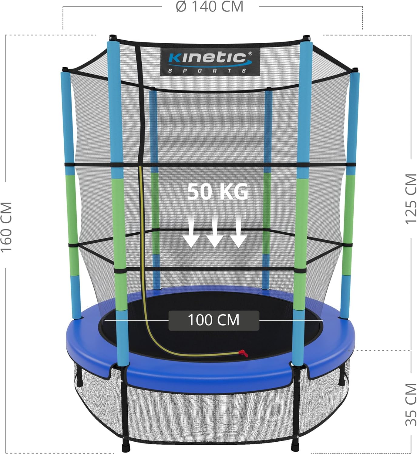 - SZCZEGÓŁY PRODUKTU: Trampolina dla dzieci ø 140 cm, wysokość całkowita ok. 162 cm, maks. obciążenie 50 kg, zalecany wiek od 3 do 8 lat, 6 gumowanych nóżek