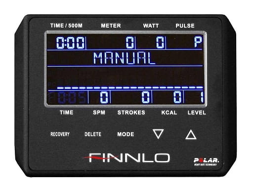 - Wyświetlane informacje: czas / moc / poziom / ilość wiosłowań na minutę / program / tętno / łączna ilość wiosłowań / czas po 500m / dystans / spalone kalorie