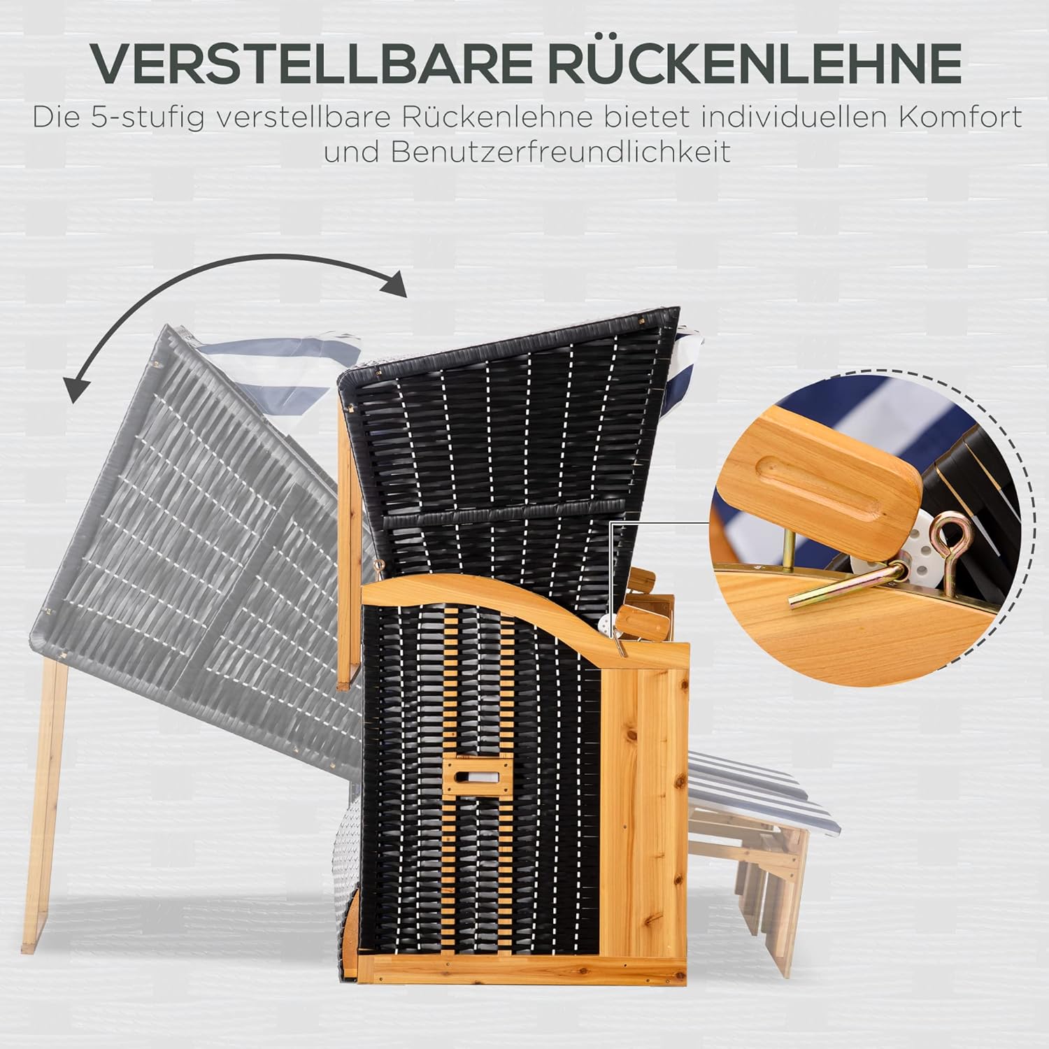INDYWIDUALNA REGULACJA: Oparcie kosza plażowego można regulować na pięciu poziomach. Pozwala wygodnie odchylić się do tyłu nawet o 150°. Wysuwane podnóżki zapewniają jeszcze większy komfort.